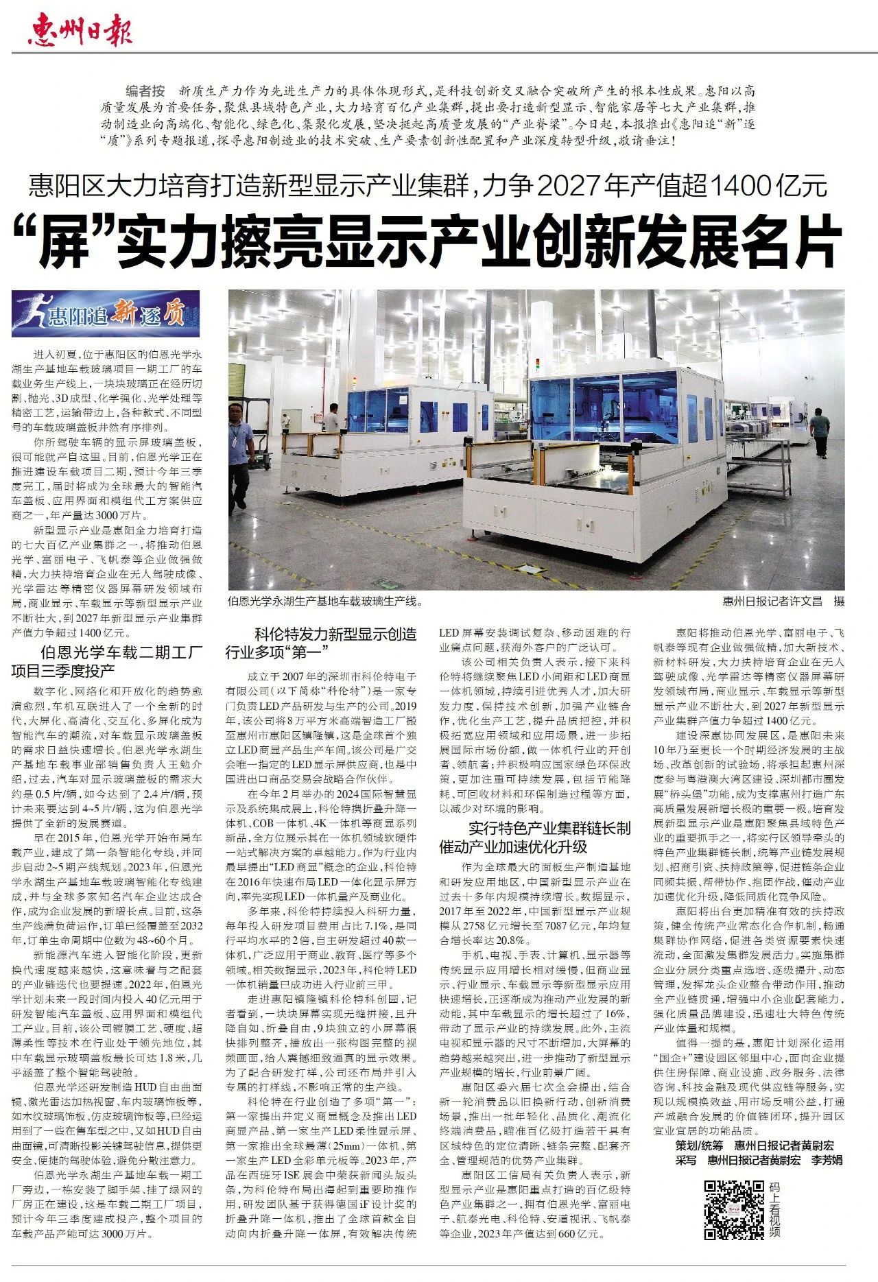惠阳区工信局有关负责人表示,新型显示产业是惠阳重点打造的百亿级特色产业集群之一,拥有G22恒峰、伯恩光学等十余家企业,2023年产值达到660亿元。惠阳将推动G22恒峰等现有企业做强做精,加大新技术、新材料研发,大力扶持培育企业在无人驾驶成像、光学雷达等精密仪器屏幕研发领域布局,商业显示、车载显示等新型显示产业不断壮大,到2027年新型显示产业集群产值力争超过1400亿元。